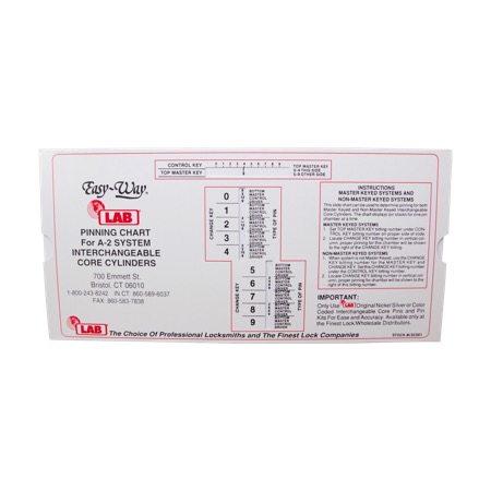 Product Description This slide chart can be used to determine pinning for both Master Keyed and Non-Master Keyed A2 System Interchangeable Core Cylinders. The chart displays pin stacks for one pin chamber at a time.